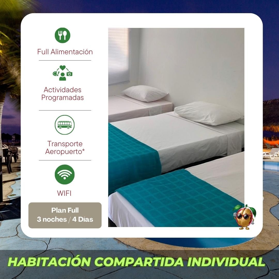 Reserva individual en habitación compartida (incluye full actividades en los días de estadía, full alimentación, recogida en el aeropuerto (horarios establecidos)). *No incluye tiquetes aéreos o terrestres.
