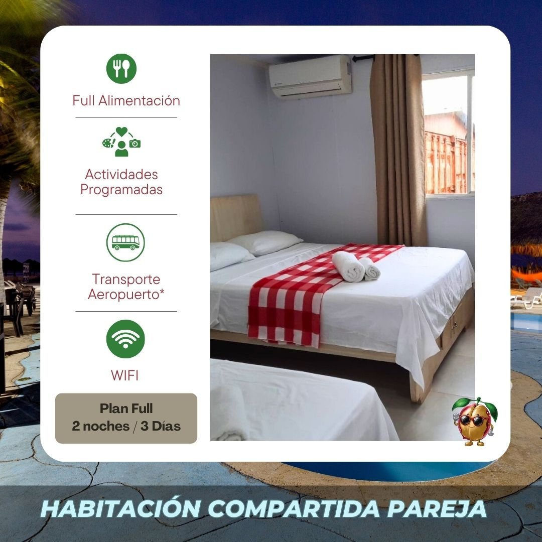 Reserva para pareja en habitación compartida (incluye actividades desde el día jueves 30 abril al domingo 03 de mayo, full alimentación,  recogida en el aeropuerto (horarios establecidos)). *No incluye tiquetes aéreos o terrestres.
