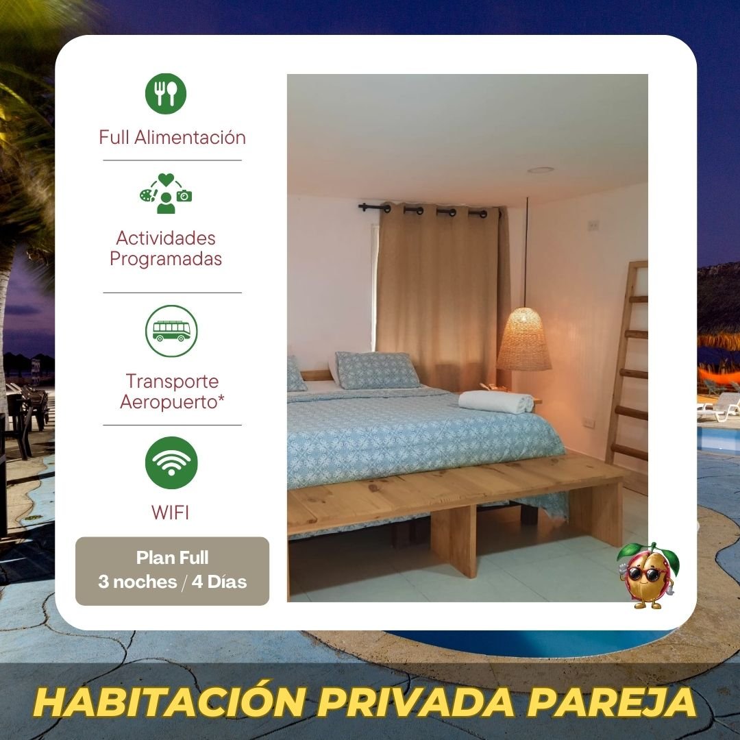 Reserva para pareja en habitación privada (incluye full actividades en los días de estadía, full alimentación, recogida en el aeropuerto (horarios establecidos)). *No incluye tiquetes aéreos o terrestres.